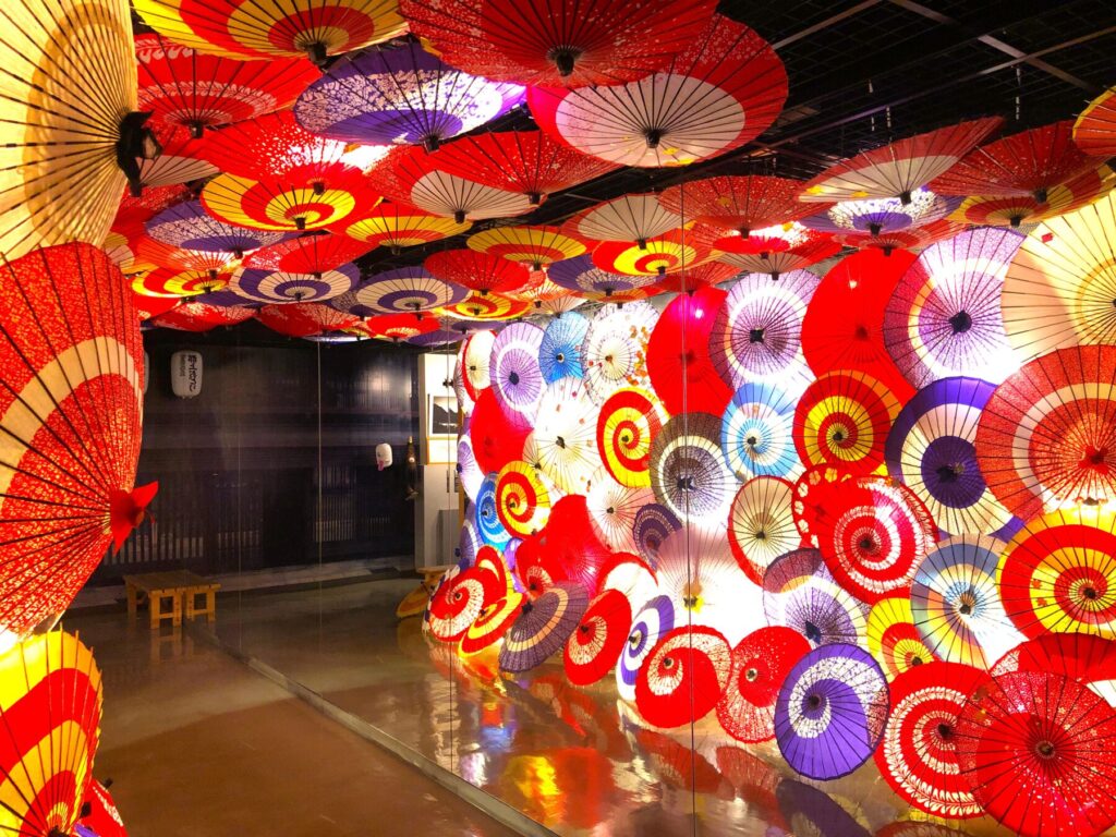 但し和傘の共演は4日間のみの実施であったため、見に来られなかった方々は勿論、見られた方々からももっと長い開催を望む声を多くいただいておりました。そんな多くのご要望にお応えして博覧館では和傘の共演を再現する新企画『 和傘トンネル 光に咲く幻想路』を開催中です!!